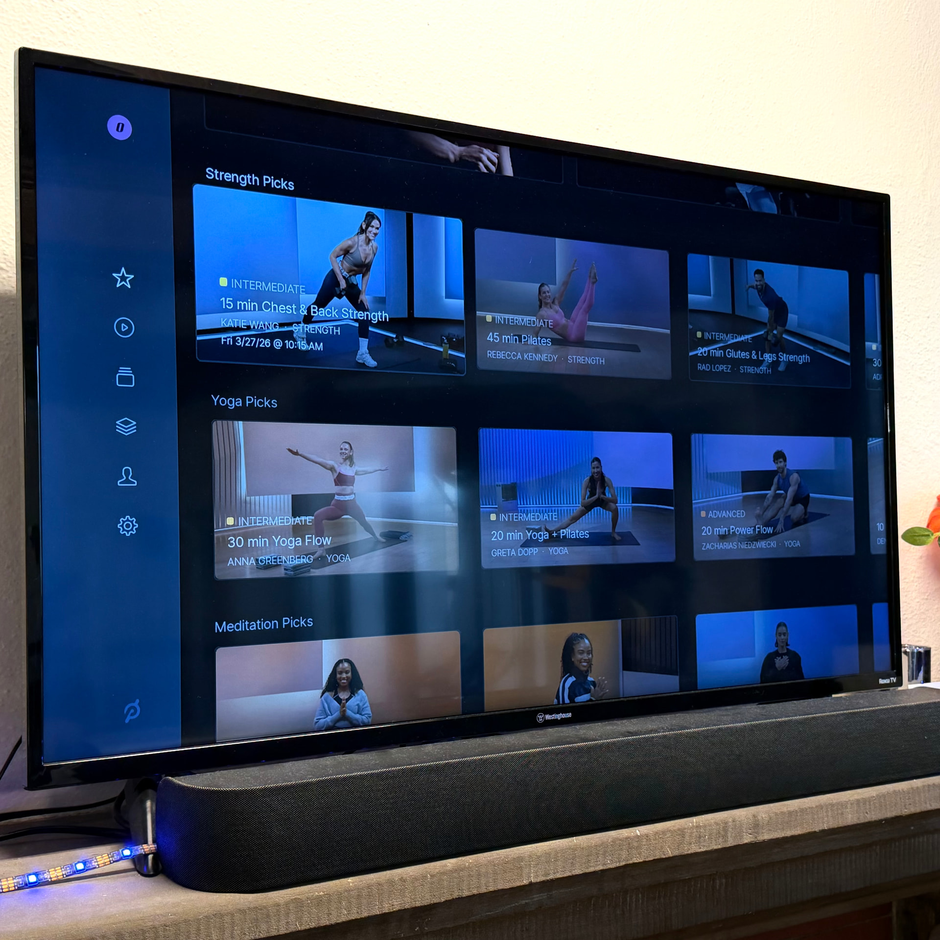 For using the Peloton workout library, the Peloton app is now active on both the bike’s screen and our Strength Room’s TV!